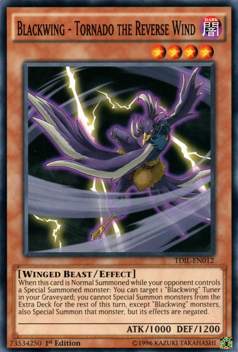When this card is Normal Summoned while your opponent controls a Special Summoned monster: You can target 1 "Blackwing" Tuner in your Graveyard; you cannot Special Summon monsters from the Extra Deck for the rest of this turn, except "Blackwing" monsters, also Special Summon that monster, but its effects are negative.