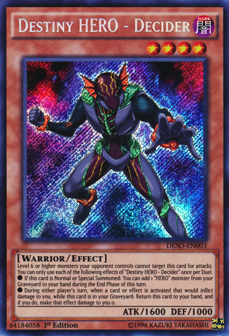 Level 6 or higher monsters your opponent controls cannot target this card for attacks. You can only use each of the following effects of "Destiny HERO - Decider" once per Duel.