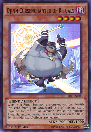 When you Ritual Summon a monster, you can banish this card from your Graveyard as 1 of the monsters required for the Ritual Summon. While the monster Ritual Summoned using this card is face-up on the field, Synchro Monsters' effects are negative.