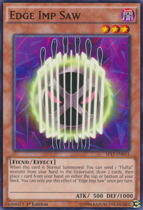 When this card is Normal Summoned: You can send 1 "Fluffal" monster from your hand to the Graveyard; draw 2 cards, then place 1 card from your hand on either the top or bottom of your Deck. You can only use this effect of "Edge Imp Saw" once per turn.