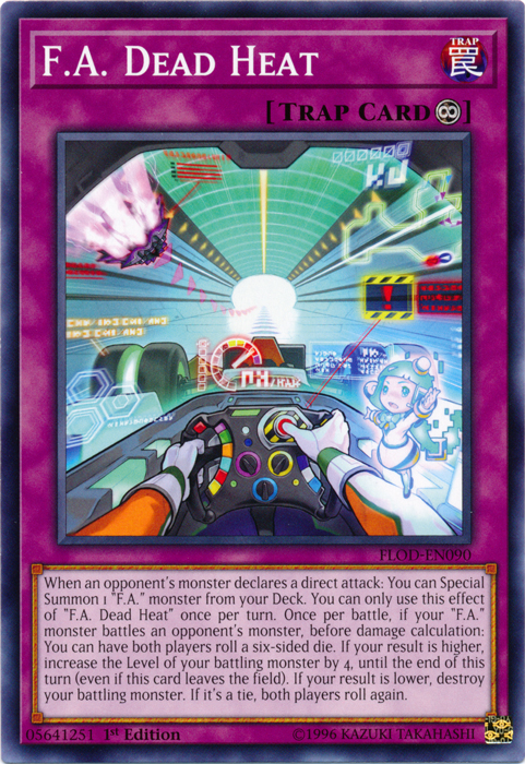 When an opponent's monster declares a direct attack: You can Special Summon 1 "FA" monster from your Deck. You can only use this effect of "FA Dead Heat" once per turn. Once per battle, if your "FA" monster battles an opponent's monster, before damage calculation: You can have both players roll a six-sided die. If your result is higher, increase the Level of your battling monster by 4, until the end of this turn (even if this card leaves the field). If your result is lower, destroy your battling monster. If it's a tie, both players roll again.