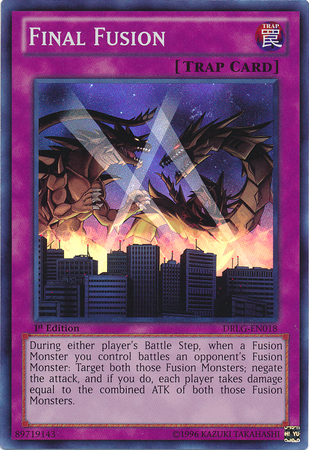 During either player's Battle Step, when a Fusion Monster you control battles an opponent's Fusion Monster: Target both those Fusion Monsters; negate the attack, and if you do, each player takes damage equal to the combined ATK of both those Fusion Monsters.