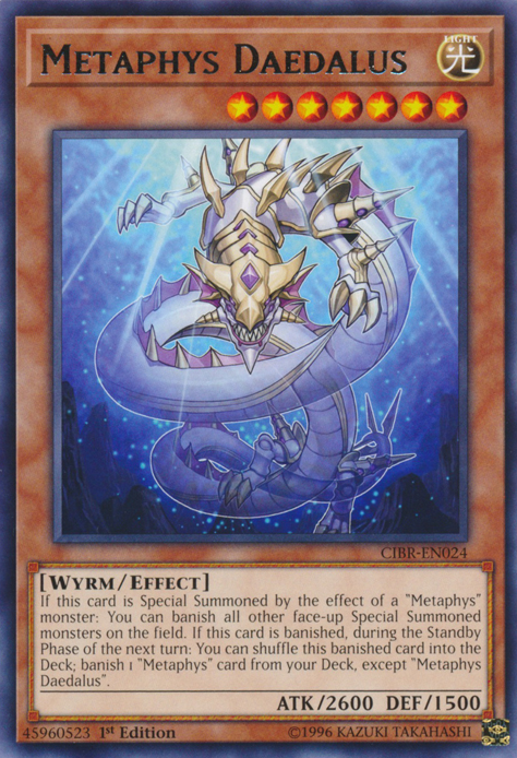 If this card is Special Summoned by the effect of a "Metaphys" monster: You can banish all other face-up Special Summoned monsters on the field. If this card is banished, during the Standby Phase of the next turn: You can shuffle this banished card into the Deck; banish 1 "Metaphys" card from your Deck, except "Metaphys Daedalus".