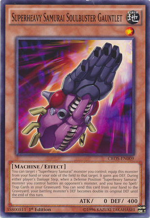 You can target 1 "Superheavy Samurai" monster you control; equip this monster from your hand or your side of the field to that target. It gains 400 DEF. During either player's Damage Step, if a Defense Position "Superheavy Samurai" monster you control battles an opponent's monster, and you have no Spell/Trap Cards in your Graveyard: You can send this card from your hand to the Graveyard; the DEF of your monster becomes double its original DEF, until the end of this turn.