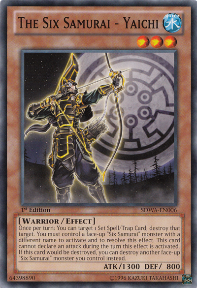 Once per turn: You can target 1 Set Spell/Trap Card; destroy that target. You must control a face-up "Six Samurai" monster with a different name to activate and to resolve this effect. This card cannot declare an attack during the turn this effect is activated. If this card would be destroyed, you can destroy another face-up "Six Samurai" monster you control instead.