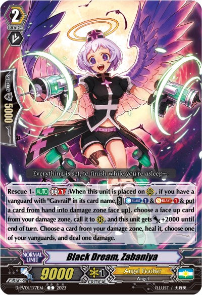 Rescue 1 -AUTO] Generation Break 1: [Counter Blast (1) & Soul Blast (1) & Choose a card from your hand, and put it into the damage zone] When this unit is placed on (RC), if you have a vanguard with "Gavrail" in its card name, you may pay the cost. If you do, choose up to one face up card from your damage zone, call it to (RC), and this unit gets [Power]+2000 until end of turn. Choose a card from your damage zone, heal it, choose one of your vanguards, and deal one damage.