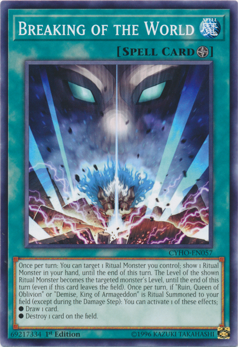 Once per turn: You can target 1 Ritual Monster you control; Show 1 Ritual Monster in your hand, until the end of this turn. The Level of the shown Ritual Monster becomes the targeted monster's Level until the end of this turn (even if this card leaves the field). Once per turn, if "Ruin, Queen of Oblivion" and/or "Demise, King of Armageddon" is Ritual Summoned to your field (except during the Dmaage Step): You can activate 1 of these effects.