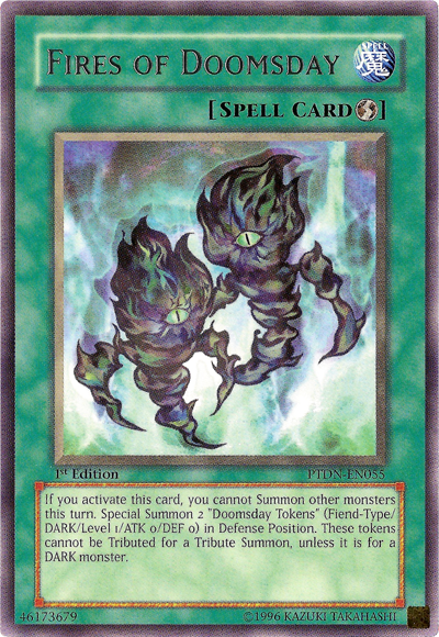 If you activate this card, you cannot Summon other monsters this turn. Special Summon 2 "Doomsday Tokens" (Fiend-Type/DARK/Level 1/ATK 0/DEF 0) in Defense Position. These tokens cannot be Tributed for a Tribute Summon, unless it is for a DARK monster.