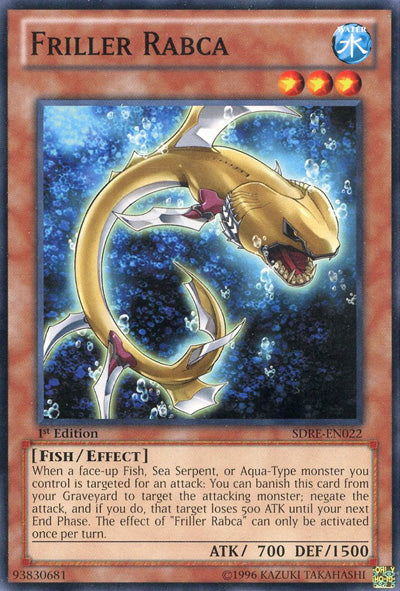 When a face-up Fish, Sea Serpent, or Aqua-Type monster you control is targeted for an attack: You can banish this card from your Graveyard to target the attacking monster; negate the attack, and if you do, that target loses 500 ATK until your next End Phase. The effect of "Friller Rabca" can only be activated once per turn.
