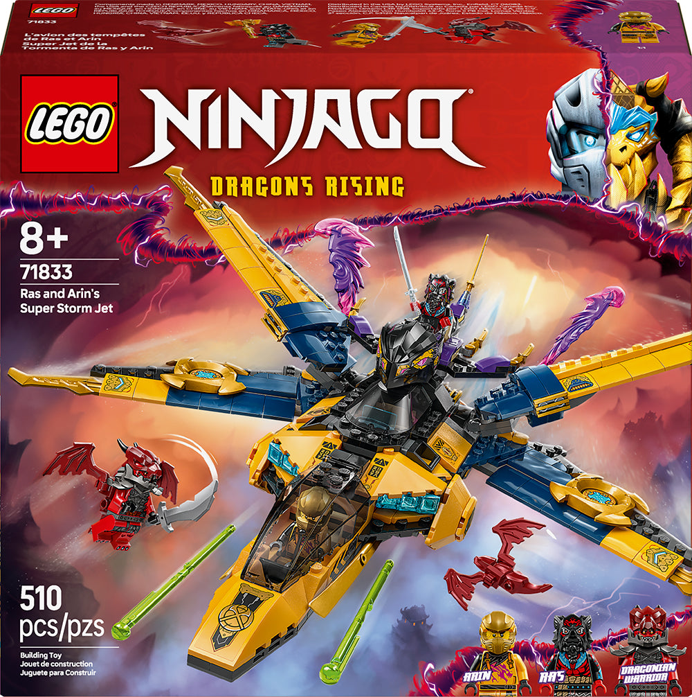 Recreate scenes from season 3 of the NINJAGO® Dragons Rising TV show with Ras and Arin’s Super Storm Jet (71833). Featuring a cool jet toy with a detachable drone and escape pod, plus Arin, Ras and Dragonian Warrior minifigures and a mini dragon critter model, this incredible LEGO® building set comes with all kids need to enjoy countless hours of role play.