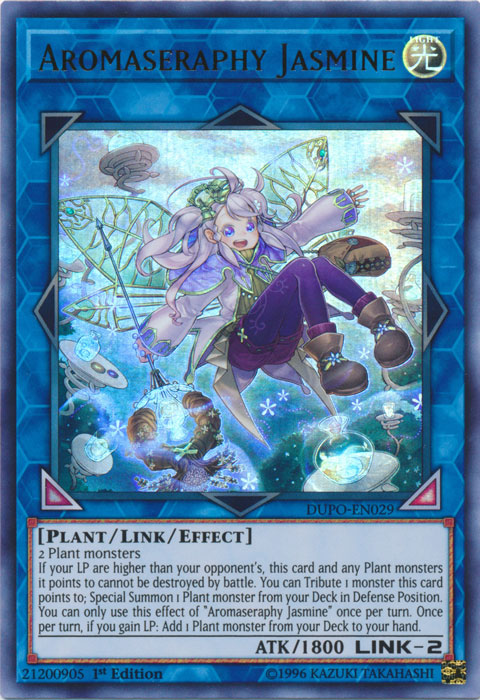 If your LP are higher than your opponent's, this card and any Plant monsters it points to cannot be destroyed by battle. You can Tribute 1 monster this card points to; Special Summon 1 Plant monster from your Deck in Defense Position. You can only use this effect of "Aromaseraphy Jasmine" once per turn. Once per turn, if you gain LP: Add 1 Plant monster from your Deck to your hand.