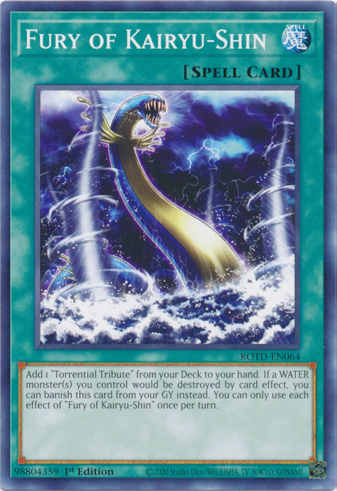 Add 1 "Torrential Tribute" from your Deck to your hand. If a WATER monster(s) you control would be destroyed by card effect, you can banish this card from your GY instead. You can only use each effect of "Fury of Kairyu-Shin" once per turn.