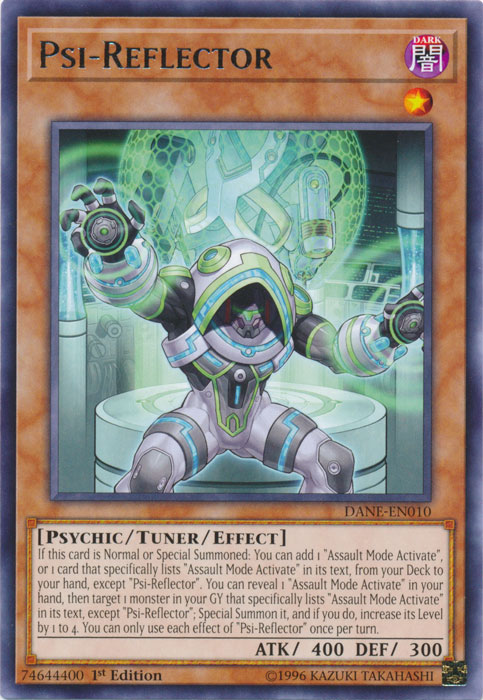 If this card is Normal or Special Summoned: You can add 1 "Assault Mode Activate", or 1 card that specifically lists "Assault Mode Activate" in its text, from your Deck to your hand, except "Psi-Reflector". You can reveal 1 "Assault Mode Activate" in your hand, then target 1 monster in your GY that specifically lists "Assault Mode Activate" in its text, except "Psi-Reflector"; Special Summon it, and if you do, increase its Level by 1 to 4. You can only use each effect of "Psi-Reflector" once per turn.