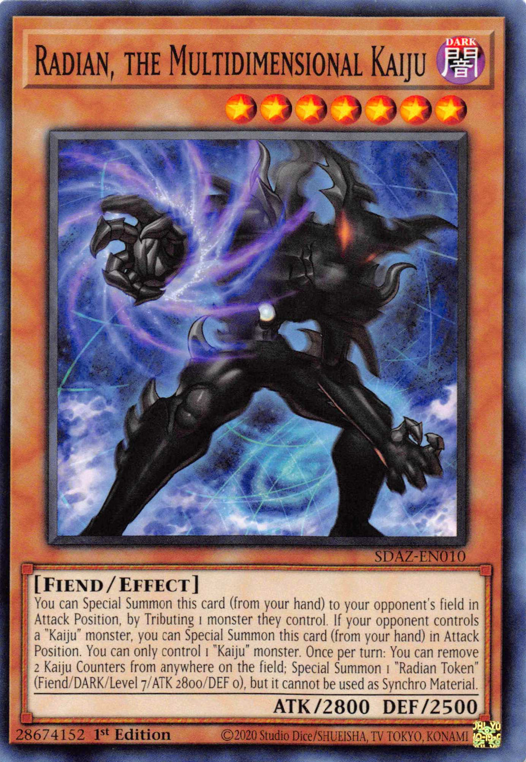 You can Special Summon this card (from your hand) to your opponent's field in Attack Position, by Tributing 1 monster they control. If your opponent controls a "Kaiju" monster, you can Special Summon this card (from your hand) in Attack Position. You can only control 1 "Kaiju" monster. Once per turn: You can remove 2 Kaiju Counters from anywhere on the field; Special Summon 1 "Radian Token" (Fiend/DARK/Level 7/ATK 2800/DEF 0), but it cannot be used as Synchro Material.