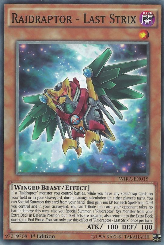 If a "Raidraptor" monster you control battles, while you have any Spell/Trap Cards on your field or in your Graveyard, during damage calculation (in either player's turn): You can Special Summon this card from your hand, then gain 100 LP for each Spell/Trap Card you control and in your Graveyard. You can Tribute this card; your opponent takes no battle damage this turn, also you Special Summon 1 "Raidraptor" Xyz Monster from your Extra Deck in Defense Position, but its effects are negated, also return it to the Extra Deck during the End Phase. You can only use this effect of "Raidraptor - Last Strix" once per turn.