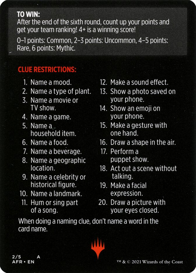 The interpreter draws a mystery card from the top of the deck, rolls a d20, and then gives a clue determined by the result of their roll (see opposite side of card). The Interpreter then draws five more cards from the deck, shuffles them together with the mystery card, and then reveals them. The other players collectively guess which of the six cards is the mystery card. If they guess correctly, all players score 1 point as a team. After guessing, the round ends and the Interpreter puts the used cards in a discard pile. If the deck runs out of cards, shuffle the discard pile to create a new deck.