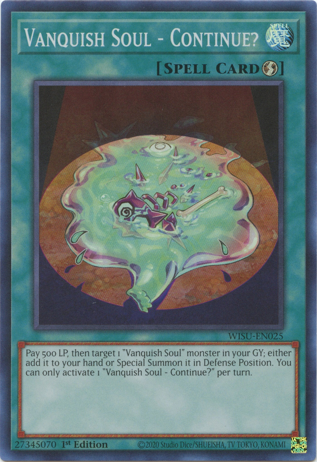Pay 500 LP, then target 1 "Vanquish Soul" monster in your GY; either add it to your hand or Special Summon it in Defense Position. You can only activate 1 "Vanquish Soul - Continue?" per turn.