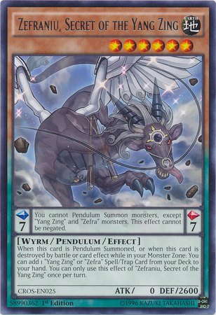 When this card is Pendulum Summoned, or when this card is destroyed by battle or card effect while in your Monster Zone: You can add 1 "Yang Zing" or "Zefra" Spell/Trap Card from your Deck to your hand. You can only use this effect of "Zefraniu, Secret of the Yang Zing" once per turn.